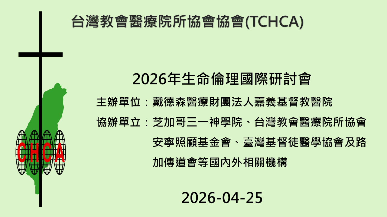 研討會主題:「2026年生命倫理國際研討會」 會議地點 地點:嘉義基督教醫院路加堂國際會議廳 地址:嘉義市東區保建街100號 日期與時間 日期:2026年04月... Read more