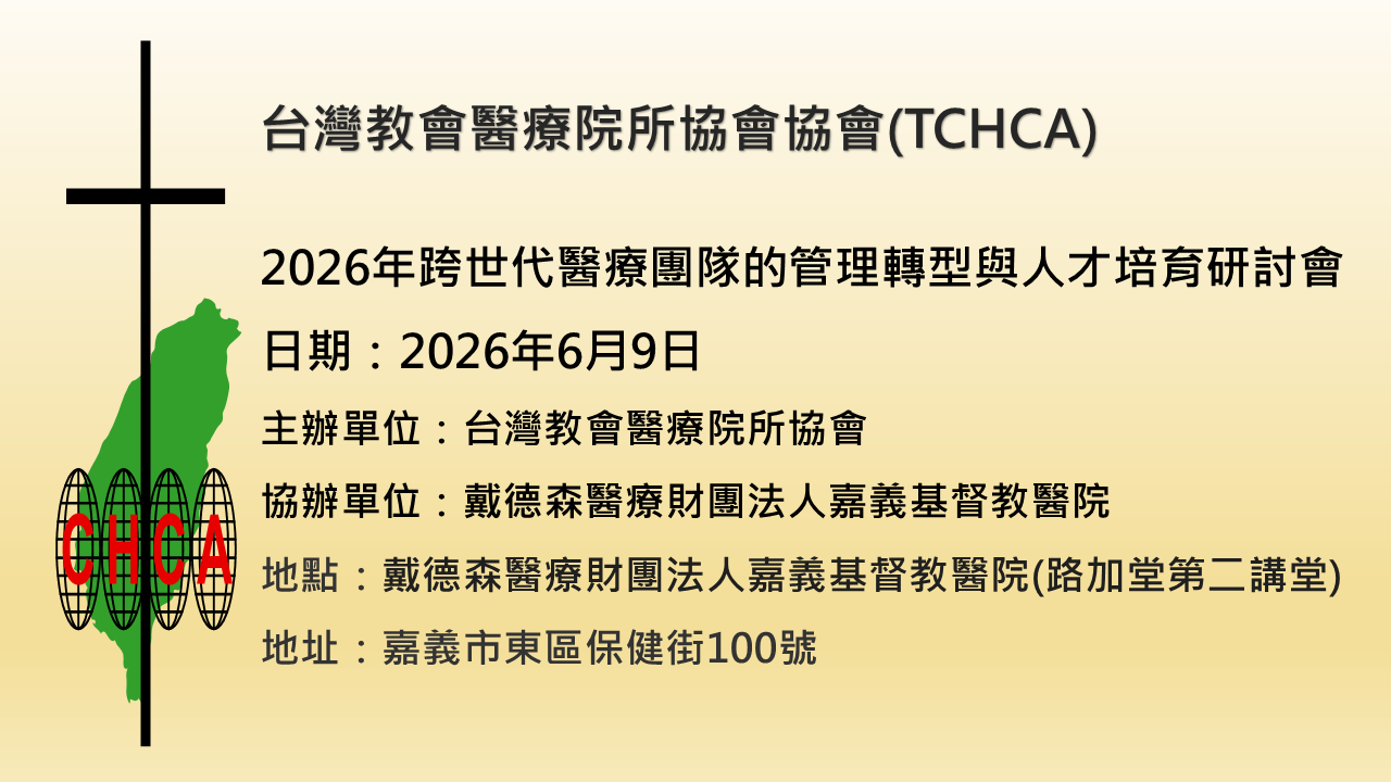 研討會主題:2026年跨世代醫療團隊的管理轉型與人才培育研討會 會議地點 地點:戴德森醫療財團法人嘉義基督教醫院(路加堂第二講堂) 地址:嘉義市東區保健街100... Read more